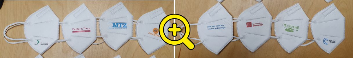Der Werbeaufdruck im industriellen Tampondruck ist hauchdünn und ausschließlich auf der Außenseite aufgedruckt. Die Schutzfunktion und Filtration wird durch den Tampondruck nicht verändert, weil die innenliegenden Filterlagen unberührt bleiben. Nach dem Druck findet keine erneute Prüfung oder Zertifizierung statt. Auf diese Basis liefern wir tausende bedruckte Masken an unsere Kunden und selbst an Universitäts-Krankenhäuser.